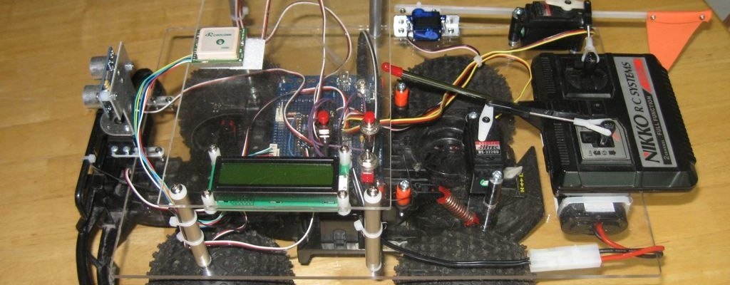 My first Robomagellan robot for the Ottawa Robotic Enthusiasts (ORE) Robomagellan competition was based on a RC Truck with minimal hacking. In order to preserve the RC Truck only the body was removed and all the robot components were mounted in an acrylic base which could easily be removed. The Radio Control was mounted in the acrylic and both sticks were controlled by servos. The electronics consisted of a Parallax Propeller Protoboard, a Parallax PMB-648 GPS, a Parallax Hitachi HM55B Dual-Axis Compass, a Parallax Ping sensor and a Parallax Serial 2×16 LCD.